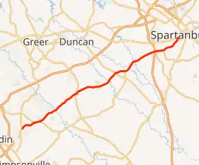 The west terminus of SC 296 is at a junction with SC 14 in west-central Greenville County and proceeds in a generally east-northeast direction. Shortly after the junction, the route merges with SC 146, but soon separates from SC 146 a short distance afterward. SC 296 then crosses into Spartanburg County as it traverses the Enoree River, and then intersects with SC 101 before passing through Reidville. Then, SC 296 intersects with SC 290 and SC 417 before intersecting with Interstate 26 (I-26) at exit 22 just outside the Spartanburg city limits. Within the city, SC 296 junctions with U.S. Route 29 (US 29) where the highway officially ends.[3]