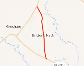 SC 908 begins at a skewed intersection with U.S. Route 378 (US 378) northeast of Johnsonville, Marion County, where the roadway continues south as a dirt road to the Woodbury Wildlife Management Area. It travels to the north-northwest and curves to a nearly due north direction. Just before it travels through Brittons Neck, it curves to the north-northwest and crosses Alligator Run. In the community, it passes a U.S. Post Office. Just after crossing Marsh Creek, it meets its northern terminus, an intersection with SC 41 at a point south of Centenary.[2]