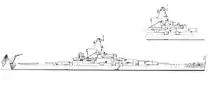 On 26 July 1954, a conversion proposal for the South Dakota-class ships was ordered by the Chairman of the Ship Characteristics Board. The request was made for the ships' speed to be increased to at least 31 knots. To do so, the design staff decided to remove the after turret and use the weight and space gained to install either a set of improved steam turbines or a set of gas turbines. Either system would have to produce at least 256,000 shaft horsepower (190 MW)—the minimum requirement to achieve 31 knots on the South Dakota hull. Unfortunately, this would have necessitated alterations to the hull form, particularly in the rear of the ship. Larger propellers were also required, and all four shafts would have had to have been completely rebuilt to accommodate the changes. Estimates for the project ran as high as $40,000,000 per ship, and this did not include the cost of reactivating the ship and upgrades to its electrical and combat systems. As a result, the conversion program was halted.[36]