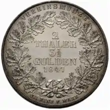 In 1857 the Vienna Monetary Treaty introduced a second Vereinsmünze in the form of the Vereinsthaler, with fractionally less silver than the Prussian Thaler, but still valued at 13⁄4 Gulden. While the 31⁄2 South German gulden coin was redenominated as 2 Vereinsthaler, no changes were made to the other denominations.
