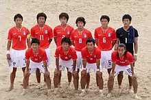 The Korea Republic national beach soccer team represents South Korea in international beach soccer competitions and is controlled by the Korea Football Association, the governing body for beach soccer in South Korea.