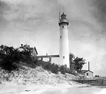 This is the third lighthouse built on the island. Construction of the first began in 1839 and the 1-1/2-story lighthouse with a lens in the cupola first went on in 1840, under the care of Lighthouse keeper William N. Burton, who had a thriving lumbering business.[2] It had a Lewis lamp, which was upgraded to a fourth order Fresnel lens /freɪˈnɛl/. Deterioration of the building led to the lighthouse being completely rebuilt in 1858. Over time this light was found to be deficient, and the current lighthouse was built in 1872. With a third order Fresnel lens sitting 91 feet (28 m) above the foundation, this light boasted a focal plane of 104 feet (32 m).[3] The site is under the control of the National Park Service, in conjunction with the Sleeping Bear Dunes National Lakeshore.[4] It is listed in the National Register of Historic Places.[5] The lighthouse was decommissioned in 1958, and is now a museum. It is not operational.[6]