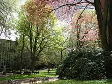 The area was the focus of a Portland Development Commission urban renewal based on a 1982 master plan, becoming an urban renewal district in 1985, and expiring in July 2008.[138][139][140] The park blocks underwent serious renovations in 1987, adding plazas, large flower beds, lighting and irrigation, and newly paved sidewalks.[140][141][142] Several apartment complexes specifically aimed at the middle class were built, including the University Park Apartments (125 units, $10.5 million, quickly sold and converted to condos), South Park Square Apartments (184 units, $16 million, completed May 1988), and Tom Mesher's Gallery Park Apartments (31 units, $3 million).[139][142][143][144][145] In 1987, the New Theater Building of the Portland Center for the Performing Arts was completed immediately next door to the Arlene Schnitzer Concert Hall.[146] The South Park Blocks Association, a commercial and institutional association, was started at that time, to attract residents and consumers to the area and to address security concerns.[142]