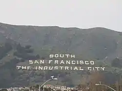 The sign spells out "SOUTH SAN FRANCISCO THE INDUSTRIAL CITY" in white-painted concrete letters and is visible to drivers on northbound U.S. 101[4] and flights to San Francisco International Airport.