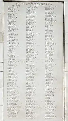 Both the 1/5th Battalion and 1/6th battalions landed at Le Havre as part of the Staffordshire Brigade in the North Midland Division in March 1915 for service on the Western Front before transferring to Egypt in January 1916 and then returning to France in February 1916.[9] They crossed the St Quentin Canal to break through the strongest sector of the Hindenburg Line during the Battle of St. Quentin Canal in September 1918.[13] Both the 2/5th and 2/6th battalions, part of the 176th (2/1st Staffordshire) Brigade of 59th (2nd North Midland) Division, were involved in hostilities in Dublin during the 1916 Easter Rising. Soldiers from the regiment killed a number of civilians in the North King Street area.[14] They then landed at Le Havre in February 1917 for service on the Western Front.[9]