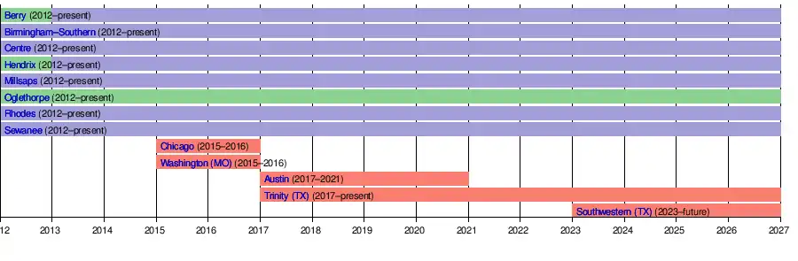 - 2017 - Austin College and Trinity University joined the SAA as associate members for football, effectively the 2017 fall season (2017-18 school year).