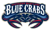 The Southern Maryland Blue Crabs official colors are navy blue, light blue, red, tan, and white. The primary logo depicts a navy blue crab outlined and detailed in tan. The crab has red pincers and eyes, with a scowl of determination. Centered above the crab is the "Blue Crabs" wordmark in white with the words "Southern Maryland" centered above in red with light blue and red ribbon-like lines underline the wordmark. The entire logo is outlined in tan.