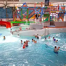 - Wave pool begins wide and shallow (much like a beach) progressively deepening into a regular swimming pool halved in width is the box-shaped "deep end" with a rope swing. (No diving).[2]