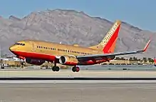 Some Southwest Airlines aircraft feature special liveries or are named with special decals. Southwest gives these aircraft special names, usually ending in "One." All special liveries painted prior to Spirit One originally wore the standard Desert Gold, red and orange colors on the vertical stabilizer and rudder. Subsequent special liveries featured tails painted with the "Canyon Blue" livery, with all earlier specials repainted with the Spirit One livery tail. Any aircraft painted in special liveries will have their winglets painted white. Missouri One was the first special livery to feature a modified version of the "Heart" tail design, with the red and yellow ribbons shrunk in order to fit the Southwest wordmark as it cannot fit on the fuselage like on the other aircraft. Previous special livery aircraft are currently being repainted with the new "Heart" tail design.[41] As of June 18, 2021, all of Southwest's special liveries are on 737-700s, with the only exceptions being Heart One, Heart Two, and Freedom One which are painted on 737-800s.[42]