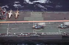 The air wing was the same as the other Kievs, consisting of a squadron of twelve Yak-38 'Forger' V/STOL aircraft (until they were retired in 1992), twelve Ka-27 'Helix-A' ASW/SAR helicopters and two Ka-31 'Helix' AEW helicopters. Flight operations were assisted by the distinctive new Cake Stand TACAN.