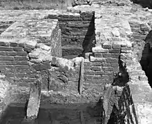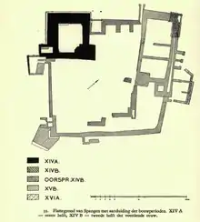 In the second construction phase a stone wall was built around the court, see map XIVB and Oorspr. XIVB. Next to the tower house was the gate.[5] The gate had two openings on the moat side (see map), probably for heavy beams that were part of the draw bridge. In the moat two poles were found, that would have supported the bridge. At 20 m outside the gate, the bridgehead was found, albeit from masonry of the last period that the castle was inhabited.[6]