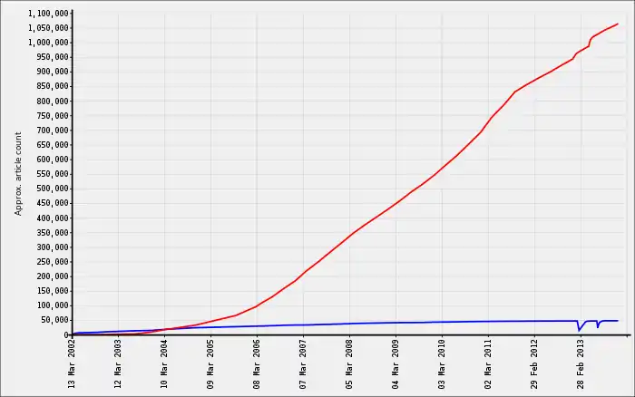 - May 16, 2013: the Spanish Wikipedia became the seventh Wikipedia to cross the million article count.