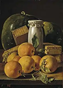 The Spanish Golden Age, a period of Spanish political ascendancy and subsequent decline, saw a great development of art in Spain.[21] The period is generally considered to have begun at some point after 1492 and ended by or with the Treaty of the Pyrenees in 1659, though in art the start is delayed until the reign of Philip III (1598-1621), or just before, and the end also delayed until the 1660s or later. The style thus forms a part of the wider Baroque period in art, although as well as considerable influence from great Baroque masters such as Caravaggio and later Rubens, the distinctive nature of the art of the period also included influences that modified typical Baroque characteristics.[22] These included influence from contemporary Dutch Golden Age painting and the native Spanish tradition which give much of the art of the period an interest in naturalism, and an avoidance of the grandiosity of much Baroque art. Important early contributors included Juan Bautista Maíno (1569–1649), who brought a new naturalistic style into Spain,[23] Francisco Ribalta (1565–1628),[24] and the influential still life painter, Sánchez Cotán (1560–1627).[25]