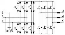 The Sparse Matrix Converter is an AC/AC converter which offers a reduced number of components, a low-complexity modulation scheme, and low realization effort.[1][2][3][4] Invented in 2001 by Prof Johann W. Kolar[5] , sparse matrix converters avoid the multi step commutation procedure of the conventional matrix converter, improving system reliability in industrial operations. Its principal application is in highly compact integrated AC drives.
