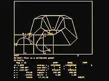 Spasim is a multiplayer space flight simulation game, in which up to 32 players fly spaceships around 4 planetary systems. Players are grouped into teams of up to 8 players, with 1 team per system; players add their names to the rosters of the four teams, named Aggstroms, Diffractions, Fouriers, and Lasers, each with a different type of spaceship from Star Trek.[2][3] Players control their ships in first person in a 3D environment, with other ships appearing as wireframe models. There is no hidden line removal implemented on the models, meaning that the models appear see-through and the player can see the wireframe of the "back" of an object as well.[2] The positions of the planets and other players relative to the player update once a second.[4] Players can fire "phasers and torpedoes" to destroy other players' ships. Spasim was intended to include an educational component; players enter instructions to move their spaceships using polar coordinates, e.g. altitude and azimuth, along with acceleration, while their position in space is given in Cartesian coordinates.[5] Players can switch their perspective between their ship, their starting space station, and torpedoes they have launched, in addition to changing the angle and magnification zoom of their camera.[3] All controls are entered via single-key text inputs.[5]
