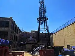 The site is also home to a 95-foot tall cellular re-transmission tower that stands above the surrounding wood-frame homes and trees of the adjacent abandoned right of way of the Rockaway Beach Branch. The gutting of the interior was completed, and new roofing was installed in July 2018. The building will be LEED certified and will incorporate 12,000 square feet (1,100 m2) of photovoltaic panels to offset tenants’ electrical costs. Greenpoint Manufacturing and Design Center has acquired $40 million in funding to complete the rehabilitation. The site will be called the GMDC Ozone Park Industrial Center.[11]