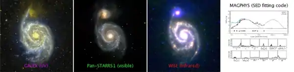 The SED of M51 (upper right) obtained by combining data at many different wavelengths, e.g. UV, visible, and infrared (left)