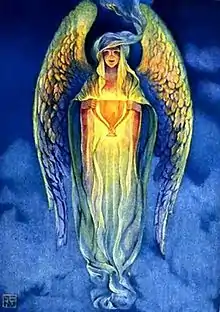 Asia held a significant interest to Nichols and he spent several years studying in Japan, China and a bit of Persia prior to a 1920 exhibit in the Madison Gallery.[13] This exhibit has the only mention of a sculpture by Nichols "A carved plaster panel is finely coloured and has much the same decorative quality as his paintings" according to American Art News. That article describes some of the paintings, saying of Nichols "He is especially happy in his rendition of limpid and luminous blues. The Dance, showing two girls in rhythmic motion is Oriental in design, line. and composition, and a rich colorful canvas. The Hall, which portrays a figure of a graceful woman an opalescent night light, is notable for the original motif and personal expression. The Pearl is imaginative, veiled in atmospheric, mysterious charm; The Mystery of India shows knowledge of the subject; Autumn Gold, presents a sweet-f aced girl, surrounded by rich Autumn foliage, a canvas handled with a reserve of color that blends harmoniously with the delicate beauty of the flesh. Throughout all the artist's work there is a decorative tendency…"