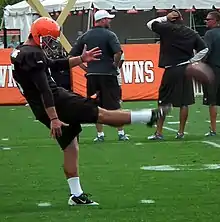 Lanning was signed by the Cleveland Browns on May 2, 2012.[6] Lanning was re-signed as a free agent by the Browns February 13, 2013.[7] On September 22, 2013, in a 31–27 win over the Minnesota Vikings, Lanning recorded a touchdown pass, punt, and an extra point. He became the first player to accomplish such a feat since Sam Baker in 1968.[8] Lanning garnered media attention following a game against the Pittsburgh Steelers on September 7, 2014. When Lanning attempted to tackle Steelers punt returner Antonio Brown, Brown "attempted" to hurdle the punter and kicked Lanning in the face. Brown was flagged for unnecessary roughness on the play and received an $8,200 fine.[9]