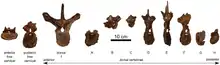 The skull has a reconstructed length of 167 centimetres. The rostral bone, the core of the upper beak, is strongly hooked. The ascending branch of the praemaxilla has a very rough outer surface, with many deep pits, indicating a strong connection to the nasal bone. The depressions on the outer sides of the praemaxillae are not connected by a perforation, though the separating bone sheath is very thin at one millimetre. The triangular nose horn has a length of 166 millimetres. The maxilla has at least twenty-eight positions in the tooth battery, each featuring three to five stacked teeth. The postorbital, or brow, horns are 228 (left) and 246 (right) millimetres long. They strongly project to the side, at an angle of 50° with the midline of the skull. Their points gradually curve to below.[1]