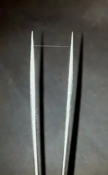 A dragline silk's tensile strength is comparable to that of high-grade alloy steel (450−2000 MPa),[12][13] and about half as strong as aramid filaments, such as Twaron or Kevlar (3000 MPa).[14]