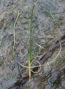 Ruppia cirrhosa is a species of aquatic plant known by the common names spiral ditchgrass[1] and spiral tasselweed.[2] It is native to the Americas and Europe, where it grows in freshwater bodies, such as lakes. It is a thread-thin, grasslike perennial herb which grows from a rhizome anchored in the wet substrate. It produces a long, narrow inflorescence tipped with two tiny flowers. As the fruit develops the peduncle of the inflorescence curls into a neat spiral.