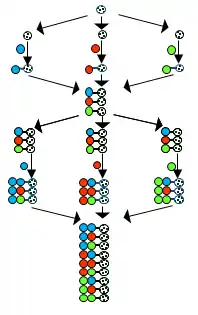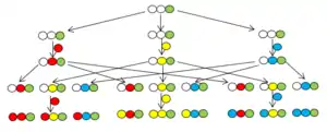 The String Synthesis introduced by Furka et al.[28] uses stringed macroscopic solid support units (crowns) and the units are identified by their position occupied on the string. One string is assigned for every building block in the synthesis. In the coupling stage, the string is in the proper reaction vessel. The content of the strings coming out from a synthetic step must be redistributed into the strings of the next step. The units are not pooled. The redistribution demonstrated in the figure follows the combinatorial distribution rule: all products formed in a synthetic step are equally divided among all reaction vessels of the next synthetic step. Different distribution formats can be followed that allows the identification the content of each crown depending on the position on the new string and the destination reaction vessel of the string.[29]