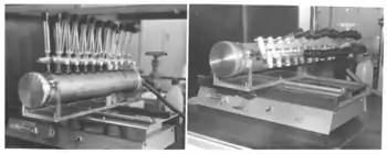 The split and pool synthesis was first applied to prepare peptide libraries on solid support. The synthesis was realized in a home-made manual device shown in the figure. The device has a tube with 20 holes to which reaction vessels could be attached. One end of the tube is linked to a waste container and a water pump. Left shows loading and filtering, right coupling-shaking position. In the early years of combinatorial chemistry, an automatic machine was constructed and commercialized at AdvancedChemTech (Louisville KY USA). All operations of the S&P synthesis are carried automatically under computer control. At present, the Titan 357 automatic synthesizer is available at aapptec (Louisville KY, USA).[6]