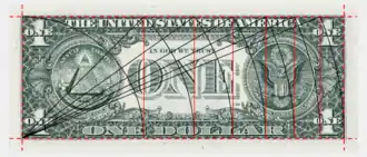 On the reverse of the current US one-dollar bill, the "large inner box" has a length-to-width ratio of the square root of 7, and a diagonal of 6.0 inches, to within measurement accuracy.[15]