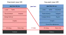 Squawk is a Java micro edition virtual machine for embedded system and small devices. Most virtual machines for the Java platform are written in low level native languages such as C/C++ and assembler; what makes Squawk different is that Squawk's core is mostly written in Java (this is called a meta-circular interpreter). A Java implementation provides ease of portability, and integration of virtual machine and application resources such as objects, threads, and operating-system interfaces.