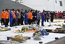 Rescuers managed to recover a life vest, pieces from the aircraft's fuselage, and a destroyed wheel rim of the Boeing 737. Most of the wreckage was found at a depth of 17–23 metres (56–75 ft).[59] On the night of 9 January, an emergency slide of the aircraft was recovered from the waters near Lancang Island, Thousand Islands.[60] The scattered debris and the small pieces of the wreckage indicated a high-speed impact. Much more wreckage was found over the next few days.[61]