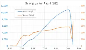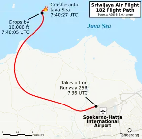 Flight 182 was climbing through 10,900 ft (3,300 m) at 14:40:05 when it experienced an upset and rolled to the left[8][13] An air traffic controller (ATC) noticed this and asked the pilots what was happening on board, but received no response.[14] According to AirNav Radarbox flight data, the aircraft reported that the climb phase of the flight was interrupted by a rapid drop in altitude from 10,900 ft (3,300 m) to 7,650 ft (2,330 m) at 07:40 UTC.[15] Flightradar24 reported that four minutes after takeoff, the aircraft dropped by 10,000 ft (3,000 m) in less than a minute.[16] The flight tracker also noted that the aircraft's last recorded altitude was 250 feet (76 m) at 07:40:27 UTC.[17] According to flight data provided, the airplane experienced a drop of 1,755 ft (535 m) in just six seconds between 07:40:08 and 07:40:14 UTC. It was followed by a drop of 825 ft (251 m) in two seconds, 2,725 ft (831 m) in four seconds, and 5,150 ft (1,570 m) in its last seven seconds.[18] During the fall, the aircraft rapidly changed speed, decreasing and increasing in seconds.[19] Its last contact with ATC was at 14:40 WIB (07:40 UTC) in a location between Laki Island and Lancang Island.[20]