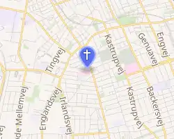 ![]() St. Ann's Church viewed from the corner of Hans Bogbinders Allé with Amagerbrogade | |