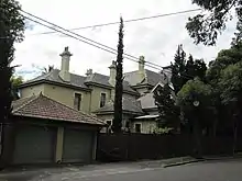 An 1892–3 two storey Victorian mansion with a slate roof, elaborate mouldings, cast iron lacework and bay windows. The street facade is dominated by a three-storey tower with a copper clad dome. Attractive mature planting and stone fence enhance its setting. St. Cloud has 9 main rooms, 3 downstairs. A billiards room was added in 1910. Later it became the administrative block for St. Joseph's Convent. In 1978 it returned to being a private residence. The tower has a copper clad dome and the spacious garden has a stone fence and mature planting.[1][6]