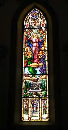 The stained glass windows were created by Guido Nincheri of Montreal sometime between 1941-1948. Nincheri also undertook replacing the interior church paintings. Further improvements that occurred during this period included; the replacement of the pews within the sanctuary, the altar, pulpit, choir loft, communion rail, flooring, confessionals, and the sloping ceiling. The chandeliers were replaced with indirect fluorescent lighting. Recessed lighting was installed over the side aisles. The majority of the carved oak interior woodwork was undertaken by local craftsman, Leopold Leclerc.[12]
