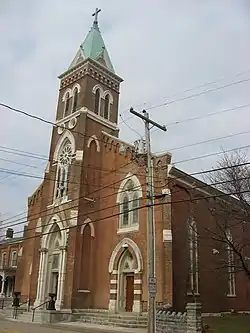 In 1853, Louisville Bishop John Martin Spalding requested the twenty-two-year-old seminarian, Father Joseph DeVries, to continue the evergrowing mission. Father DeVries and eight other missionaries were ordained in 1855.[4] The Church began its foundations in 1859 when a small frame building was constructed for a school of boys but was used for Mass on Sundays. The Church's deed stated that the Church is designated for the Catholic people of Warren County. Francis Leopold Kister, a master German architect began designing and building the structure. The walls were not yet plastered when the first Easter Sunday Mass was held. The Church was completed in 1889 because the Civil War created interruption to the building process.[5] The bell for the church weighing six-hundred pounds, was cast in Troy, New York. Once brought to Kentucky, it was blessed in 1863 and is still in use today.[5] The steeple is 142 feet tall and the highest in the city at the time.[5]