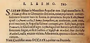 - The Latin reads as "....S. Lesmo, abbas in montibus Argadiae, non longe monasterio S. Filani, postea in Glentanire eremita, cujus praeclaram conversationem servant loca in Scotia; in provincia Stryla Killesmont, quasi Lesmonis cella Thomae Dempsteri ac majorum, cum arce, patrimonium; in Argadia Kilmon, corrupte pro Killesmon, prope Touuart; in Glascoensi agro Lesmohago, licet haereticus historicus somnium fingat, ut sit e Gallico “L’église de Mathul” sive ecclesia Mathuli, nulla vocum vicinia. Acta omnia, quantum sciam, interierunt. Vixit confessor anno DCCXXXI. Colitur ix. Decembris....". A good translation of this Latin is almost impossible. Skilful translation reads as "....St. Lesmo, Abbot in the mountains of Argadia not far from the monastery of St Filanus [St Fillan], afterwards a Hermit in Glen Tanar, whose outstanding way of life they preserve [i.e. commemorate] in Scotland, in the province of Stryla Killesmont, as if the cell of Lesmo, of Thomas Dempster, and the older people [or ancestors], with a ?high point/citadel, a patrimony, corrupted in Argadia (to) Kilmon, for Killesmon, near Tanar, in the territory of Glasgow, (called) Lesmohago, it is permitted for the heretic historian to create a dream, as is in French L’Eglise de Mathul, or the Church of Mathul, with no nearness of sounds, all his Acts [i.e. deeds, achievements], as much as I know, have perished. He lived, a Confessor, in the year 733.1. He is celebrated on December 9th....". Some of the self-references to Dempster (as writer) are confusing.
