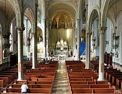 Emanuel Church, the first Catholic parish in Dayton, was formed in 1837.[2]: 357 Many English-speaking families left to form a separate parish in 1846, but Emanuel continued growing to the point that division was necessary by the end of the 1850s. Accordingly, land was chosen on Xenia Avenue at the Allen Street intersection in one of the city's eastern neighborhoods, and the owner donated enough property to permit the construction of a church, rectory, and school.[2]: 358 Archbishop Purcell of Cincinnati laid the cornerstone in April 1859, and the finished building was consecrated by Purcell and Henry Damian Juncker, the Bishop of Alton, in August of the following year. The building measured 110 by 50 feet (34 m × 15 m), but by the opening years of the twentieth century, the parish had outgrown it, and construction began on a new building; Archbishop Moeller laid the cornerstone in July 1905 and consecrated it in November 1906.[2]: 359 Growth continued, and St. Anthony's Church was established in 1913 by families coming out of St. Mary's.[3]