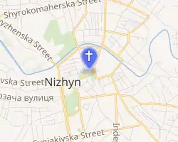 St. Nicholas Cathedral in Nizhyn (Ukrainian: Собор Святого Миколая, Sobor Sviatoho Mykolaia; Russian: Свято-Николаевский кафедральный собор) is the main Eastern Orthodoxy church of Nizhyn eparchy in the Ukraine. The powerful centric 55-metres high building with five domes has become a prototype Ukrainian baroque architecture of stone five-domed cruciform churches. The cathedral reproduces in brick the techniques conventional to Ukrainian wooden folk architecture.