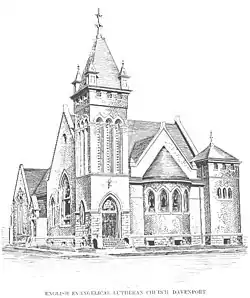 The Lutheran Church was the last mainline Protestant congregation to organize in Davenport.[2] Early attempts were made among the German immigrants, but they were met with only minimal success. In 1861, a German Lutheran minister was sent to Davenport. A year later he started organizing First German Evangelical Lutheran Zion Church and a building was erected in 1866. Theological disagreements erupted within the congregation and the pastor and a group of parishioners left to form Trinity German Evangelical Lutheran Church in 1869. They affiliated with the Lutheran Church–Missouri Synod. Zion languished until a new wave of German immigration came into the city in the 1870s. They continued German language services until World War I. Both Zion and Trinity remain in existence.