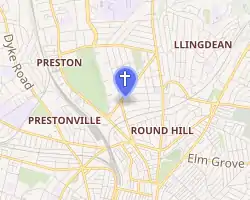 St Saviour's Church was a slightly earlier church which stood (at 50.8360°N 0.1339°W) on Ditchling Road in the Round Hill area of Brighton, southeast of St Augustine's. It was built by local architects Edmund Scott and Frank Cawthorn in 1886 in the Early English style, in flint, stone and red brick.[4] It was extended in 1889, but a proposed tower was never built.[5] Declared redundant and closed in 1981, it was demolished in 1983 and replaced by flats. The former parish was then absorbed by that of St Augustine's Church.[6] The Diocese of Chichester in turn declared St Augustine's redundant as from 22 January 2003,[7] and it officially closed in 2003.[3] It has stood empty since then. The parish, now called St Augustine and St Saviour, was added to that of St John the Evangelist's Church, the parish church of Preston Village, whose parish was renamed "Preston, St John the Evangelist with Brighton, St Augustine and St Saviour" accordingly.[8]