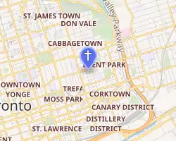 St Bartholomew's Episcopal Mission Church was founded in 1873 as a mission of All Saints, Sherbourne Street. The architect was Walter Reginald Strickland.[2] St Bartholomew's Church stood until 1910 at the end of Beech Street (now Dundas Street East) on the east side of River Street.[3] The parish of St Matthew's, Riverdale, in its turn, began life as a mission of St Bartholomew's in 1874.[4] A second mission church, St Augustine's, was established on the corner of Spruce and Parliament streets in Cabbagetown in 1888. It became an independent parish in 1905 and was destroyed by fire in 1931.[5][6]