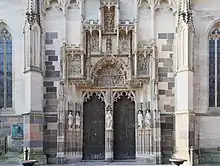 Design of the north portal is rare according to medieval tradition in which the north sides of churches did not have portals. Its statues are the most decorative out of the three portals of the cathedral. The reason for this is probably its facing the busiest part of medieval Košice-to the city market and the city hall. The portal is known as The Golden Gate, because it was gilded in the Middle Ages. The north portal has two entrance doors. Above those is an arch with a relief of The Last Judgement.
