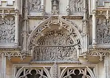 The relief is divided into two parts. In the lower one is seen a crowd of people heading to the gates of heaven, where they are welcomed by an angel, and the others who are going to hell are heading to the leviathan's jaws with devils and are in chains. The upper part shows the Last Judgement, the two angels with horns announcing the end of the world. The other figures represent the 12 apostles. Around the relief of the Last Judgement is in three degrees placed five frame reliefs decorated by pinnacles, profilation and traceried motives. Two lower reliefs refer to the life of St Elisabeth. The other three recreate the scene from Calvary.