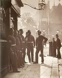 The barracks, which were designed by John Nash and built as the main recruiting depot for the London area,[1] were completed in 1826.[2] Recruiting sergeants for the regiments based at the barracks tended to operate within a tight area defined by St. George's Barracks, Trafalgar Square and Westminster Abbey.[3] The barracks, which were also used as facilities to accommodate regiments of foot guards,[4] were retained into the 20th century because of the need for troops to be at hand to quell disturbances in Trafalgar Square.[5] They were ultimately demolished in 1911[6] and the site is now occupied by the National Portrait Gallery.[7]