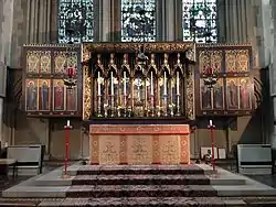 Historic England, recording St Giles' Grade II*-listed status, describes it as being "of outstanding quality by virtue of its collection of medieval and C18 survivals, together with C19 fittings by many of England's leading church decorators".[1] The interior was decorated in the style favoured by the Oxford Revival,[15] with Sir Charles Kempe and Sir Ninian Comper commissioned to provide much of the design work,[16] and the church still houses works after Michelangelo and a copy of Chatsworth House version of the Adoration of the Magi by Paolo Veronese. Much of the wood carvings were supplied in the late 19th century by Bavarian wood-carvers from Oberammergau. The altar rails came from the English Church in Rotterdam.