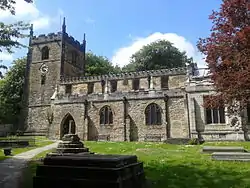 In the churchyard are the base and truncated shaft of a 14th-century stone cross. Its gritstone base, with four steps, and plinth are thought to be original, while its socket stone and shaft are believed to be 18th- or 19th-century replacements. The cross is a Scheduled Ancient Monument[5] and is Grade II listed.[6]