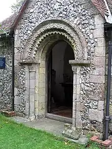 The most distinctive features of the church are its two surviving Norman-era structures: the south doorway and the chancel arch. These are densely and richly carved with a wide range of decorations, including bizarre monsters and unusual beakhead-shaped designs.[7][9][21] The latter are rare in Sussex—only St Mary's Church at Broadwater and St Mary de Haura Church at Shoreham-by-Sea have similar designs.[7] The doorway, whose door has decorative strap hinges, has three layers of carvings in its semicircular arch; they are in the form of chevrons, stars and grapes.[6][7] The chevrons form a zigzag pattern and reach the jambs and capitals; the outside face has the grape-like motifs in the angles where these meet, and the labels (horizontal elements) have the repeating star pattern.[22][23] Nikolaus Pevsner describes the carvings as "keeping inside the established pattern" of such work, and not displaying the "extraordinary ... [simultaneously] mannered and extrovert" details of the carved doorway at St Mary's Church at nearby Climping.[5][24]