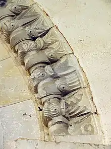Inside, the carvings around the chancel arch—dating from about 1140, like the doorway—consist of "an amazing congregation of grotesque monsters",[21] "boggle-eyed ... with beaks, tongues and squid-like tentacles, that frown and glare at visitors below".[6] The roll mouldings of the arch are held in the beaks of these "fearsome",[9] "wide-eyed horrors".[21] Such "beakhead" decoration is a little-understood feature of Late Norman architecture:[9] in churches, it may have been used to capture the congregation's interest or to inspire fear and awe.[6] The moulding has two orders (recessed jambs which together form a chamfered opening):[25] in contrast to the lavishly decorated outer order, the inner order is plain.[9][10]