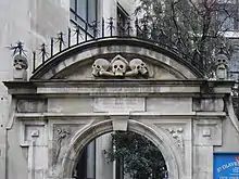 St Olave's has a modest exterior in the Perpendicular Gothic style.[1] with a somewhat squat square tower of stone and brick, the latter added in 1732. It is famous for the macabre 1658 entrance arch to the churchyard, which is decorated with grinning skulls.[16] The novelist Charles Dickens was so taken with this that he included the church in his book of sketches The Uncommercial Traveller, renaming it "St Ghastly Grim".[17]
